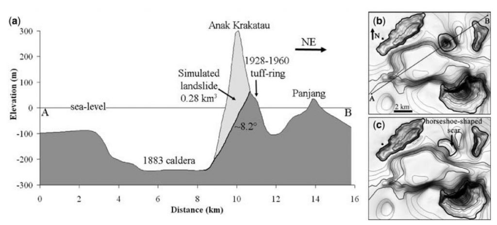 Des sondages rapides effectués en 1928 ont montré que le versant ouest du volcan était considérablement plus raide (supérieur à 28°) que le côté est, en raison de sa position sur la paroi escarpée du bassin d’effondrement de la caldeira et du fort courant qui court généralement du sud ouest ou Nord Est. Deplus et al. (1995) ont montré que cette pente existait encore en 1995 et que les éruptions successives n’avaient pas entraîné un remplissage de la caldeira. D’après ces données concernant les pentes abruptes sur lesquelles Anak Krakatau est construit et le fait que ce volcan se développe vers le Sud Ouest, des glissements de terrain sur son flanc sud-ouest ne peuvent être exclus. Un tel glissement de terrain serait dirigé vers le sud-ouest dans la caldeira de 1883 et déclencherait des vagues qui se propageraient dans le détroit de Sunda, affectant éventuellement les côtes indonésiennes.