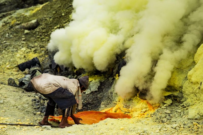 Le Kawah Ijen, connu pour ses flammes bleues, son soufre et ses porteurs de soufre. Il culmine à 2386m d’altitude. Il est aussi fameux pour son grand lac d’acide vert émeraude.