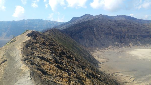 Après les escaliers du Bromo tournez à gauche (la droite du cratere est plus dangereuse) et suivez la crêtes du Bromo (déconseillé pour les personnes sujettes au vertige) et suivez la jusqu’au bout! Vous tomberez sur un ancien cratere endormi, vous pouvez également parcourir la crête de ce cratere éteint. Plus loin vous trouverez un autre cratere avec une forme irrégulière et vous pouvez continuer jusqu’au promontoire, qui n’est pas le plus haut (quelques dizaines de mètres en moins que le sommet le plus haut du massif de cratere au milieu de la caldeira du Tengger-Bromo, qui culmine à presque 2500m).