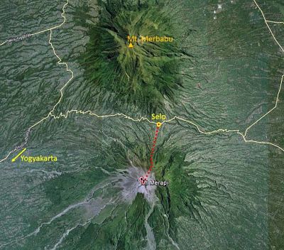 Le Merapi est accessible depuis le village de Selo. Selo est accessible depuis Yogyakarta qui possède un aéroport international, mais aussi depuis Solo (Surakarta).